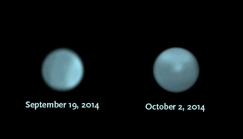 Australian amateur astronomer Anthony Wesley took these composite images of Uranus on September 19th and October 2nd, showing the dramatic appearance of a bright storm on a planet that normally displays only a diffuse bright polar region. The color is from RGB filters, but the spot appears in infrared. Anthony Wesley