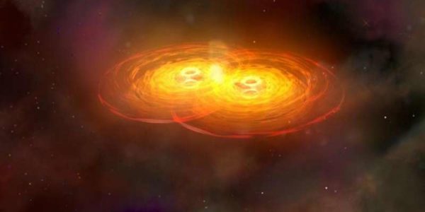 An artist’s concept of two colliding black holes, in the…
